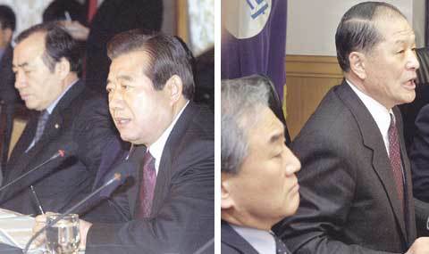 16일 민주당 한광옥 대표가 서울 삼청동 총리관관에서 열린 제2차 고위당정조정회의에서 인사말을 하고 있다. (왼쪽). 비슷한 시간 한나라당 3역회의에서 이상득 사무총장이 이용호 게이트 진상규명 방안을 보고하고 있다.