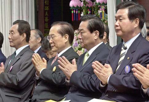 19일 서울 조계사에서 열린 부처님 오신 날 봉축법요식에 참석한 여야 지도자들이 예불하고 있다. 왼쪽부터 고건 서울시장, 한나라당 이회창 후보와 서청원 대표, 민주당 한화갑 대표. 서영수기자 kuki@donga.com