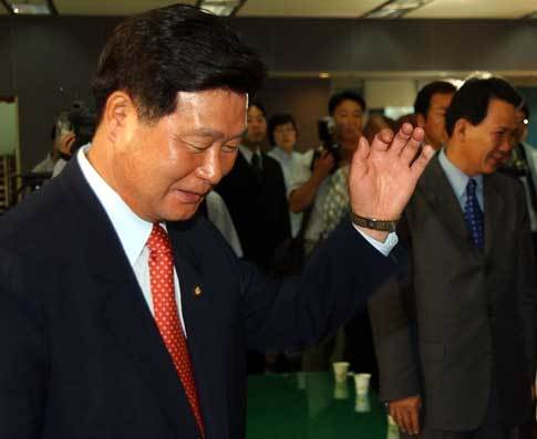 13일 오후 지방선거가 끝난 직후 여의도 민주당사 상황실에서 TV선거방송을 지켜보던 한화갑대표가 한나라당에 큰 차로 패배하는 것으로 보도되자 자리를 뜨면서 기자들의 질문을 막고 있다. 「연합뉴스」