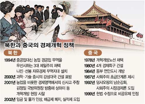 중국의 경우 개혁을 주도한 정치 엘리트들이 마오쩌둥(毛澤東) 시절 문화혁명의 희생자로서 경제개혁에 대한 이데올로기적 갈등이 적었으나 북한은 김정일(金正日) 국방위원장이 김일성(金日成) 주석의 주체사상 및 자력갱생 원칙을 수정 또는 부정하는 위험을 감수해야 하므로 정경분리적 접근에 한계가 있다.