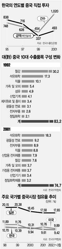 한국수출입은행에 따르면 수교 10년간 한국의 대중국 직접 투자도 크게 늘었다. 2001년말 현재 대중투자는 6054건, 54억5000만달러. 중국은 미국에 이어 제2의 투자 시장으로 떠올랐다.