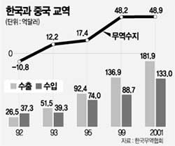 한국의 대중교육은 수출이 92년 26억5000만달러에서 지난해 181억9000만달러로 6.9배(전체 수출 증가는 1.9배) 늘었으나 수입은 37억3000만달러에서 133억300만달러로 3.6배 늘어나 수교 이듬해부터 계속 흑자다. 중국에 공장을 세운 한국업체들이 한국산 원부자재 수입을 늘린 것도 한 원인이다.