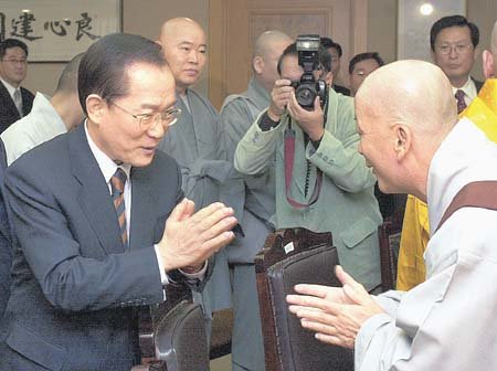 한나라당 이회창 대통령후보(왼쪽)가 30일 당 불교대책위 발대식에 참석한 스님들과 인사를 나누고 있다.서영수기자 kuki@donga.com