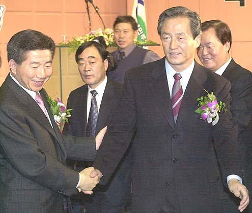민주당수도권합동후원회가 열린 63빌딩을 방문한 정몽준후보와 노무현후보가 참석자들에게 인사를 하고 있다.안철민기자 acm08@donga.com