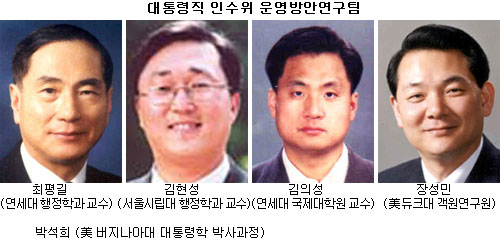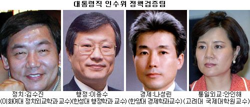 따라서 앞으로 구성될 노무현(盧武鉉) 대통령 당선자의 인수위에도 선거운동에 참여한 정책전문가와 전문성을 인정 받은 국회의원도 일부 참여시키되 노 당선자의 정책에 공감하고 비판적 대안을 제시할 수 있는 기업연구소 연구원 및 기타 영역별 전문가를 두루 기용하는 것이 바람직하다고 본다.