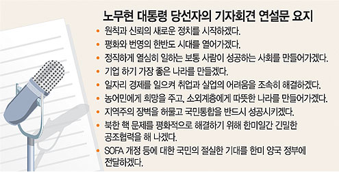 “대외관계에 있어서는 지난번(미군장갑차에 희생된) 미선 효순양 사건으로 국민의 감정이 크게 표출되고 있는 것 외에 관계 자체를 갑자기 크게 바꾸라는 요구는 없다. 기조는 크게 바꾸지 않는 범위에서 방향을 설정할 것이다. 한미 관계는 국민의 자존심과 국가의 위신을 서로 존중하는 상호 협력·평등의 관계로 발전시켜 나갈 것이다.”