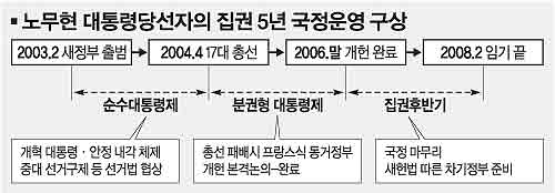 ▽집권 1기 ‘순수 대통령제 운영’〓“2004년 총선까지는 순수대통령제에 가깝게 정국을 운영하겠다. 개헌 논의는 2006년부터 시작하자”는 노 당선자의 구상은 뒤집어 얘기하면 여소야대(與小野大) 상황을 감안, 집권 초기엔 초당적으로 국정을 운영하겠다는 뜻으로 볼 수 있다.