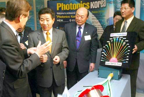 전국순회토론을 위해 28일 광주를 방문한 노무현 대통령당선자(가운데)가 광주과기원에 들러 설명을 듣고 있다.