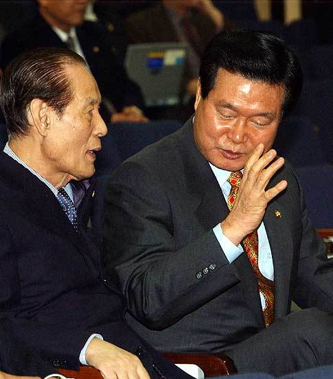 17일 오전 국회에서 열린 민주당 의원총회에서 한화갑대표가 현대상선 대북송금문제에 대해 특검제를 주장하는 이만섭전국회의장과 의견을 나누고 있다.「연합」