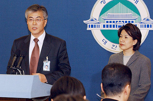 문재인 대통령민정수석비서관(왼쪽)이 25일 청와대 브리핑룸에서 새 정부의 사정활동에 관한 노무현 대통령의 발언 취지를 보충설명하고 있다.