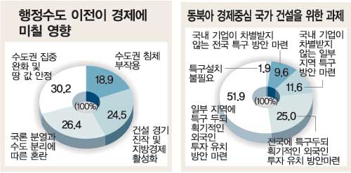 ‘행정 수도 이전에 대한 평가와 경제에 미치는 영향’에 대해서는 ‘수도권 집중 완화와 땅값 안정’(30.2%), ‘건설 경기 진작과 지방경제 활성화에 기여’(24.5%) 등으로 긍정적인 평가가 약간 우세했다.