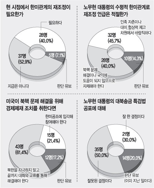 한미관계의 재조정 문제와 관련해서는 소장파 의원들을 중심으로 “일방적 한미관계는 재조정돼야 한다”는 의견(40%)이 적지 않았지만 “원칙적으로 찬성하지만 지금은 그럴 때가 아니다”(52.9%)는 ‘보수적’ 의견이 더 많았다.