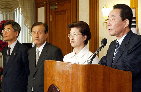 28일 오후 서울 세종로 정부중앙청사에서 고건 국무총리(오른쪽)가 ‘사스 관련 긴급 관계장관회의’를 주재한 뒤 대국민담화문을 발표하고 있다.