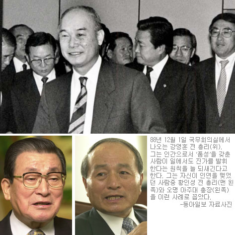 이를 계기로 마음속 깊이 가까워진 두 사람은 지금까지 서로를 존경하는 첫 번째 인물로 꼽기를 주저하지 않는다. 강 전 총리가 국무총리(88∼90년)를 지낸 지 3년 만에 역시 총리가 된 황 전 총리는 어려운 일이 있을 때마다 강 전 총리의 조언을 구하곤 했다.