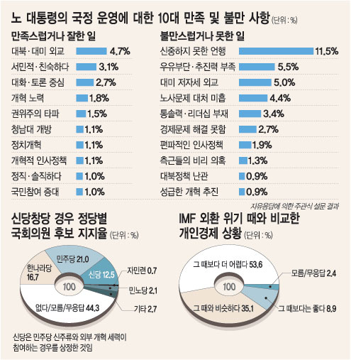 ‘노 대통령의 국정운영 중 불만스럽거나 잘못한 것’을 묻는 주관식 설문에는 ‘신중하지 못한 언행’이 11.5%로 1위를 차지했다. 대미 외교는 ‘잘한 일’ 1위와 ‘못한 일’ 3위에 각각 올라 보수-혁신간의 엇갈린 평가가 그대로 반영됐다.