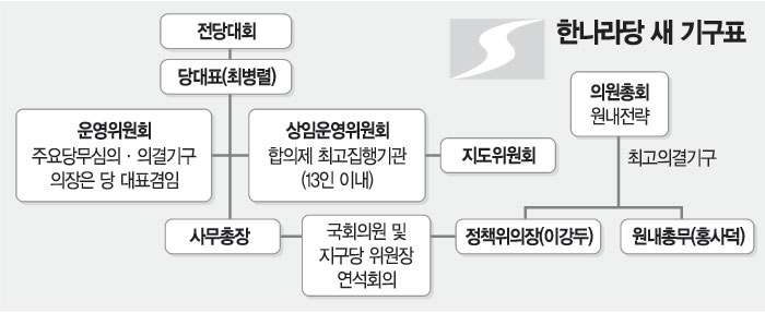 한편 최 대표 체제 출범 후 위상이 크게 강화된 당 기구는 의원총회와 상임운영위원회. 의원총회는 원내 전략과 국회직 인선을 총괄하도록 돼 있고 상임운영위원회는 주요 당무를 통할 조정하는 최고 집행기관으로 부상했다.