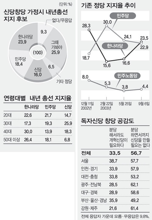 ▽한나라당 역전=9월 6일 현재 정당 지지도는 한나라당(23.5%)이 민주당(22.9%)을 조금 앞섰다. 오차의 범위 내에 있지만 한나라당이 민주당 지지도를 넘어선 것은 지난해 12월 11일 이후 처음이다. 20, 30대가 민주당을 지지하고 40대 이상은 한나라당을 선호하는 구도는 여전했다.