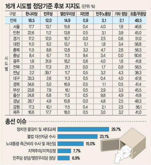 또 다른 특징은 정치에 대한 무관심의 확산추세다. 이번 여론조사에서는 응답자의 57.4%가 ‘총선에 관심이 없다’고 답했다. 특히 ‘어느 당 후보를 지지하겠느냐’는 질문에도 48.5%가 응답을 하지 않아 부동표의 향배가 막판 총선 승부를 가를 것임을 암시했다.