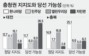 그러나 유권자가 체감하는 당선 가능성은 자민련(22.6%)이 가장 앞섰다. 이어 한나라당(15.2%) 민주당(7.3%) 우리당(4.3%)이 뒤를 이었다. 특히 대전 충남은 자민련 정서가, 충북은 한나라당 정서가 크게 작용하고 있는 것으로 나타났다(표 참조).
