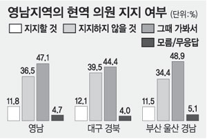 특히 지난해 대구지하철 참사를 겪었던 대구지역의 경우는 ‘지지하지 않겠다’는 응답이 41.9%에 달했다.