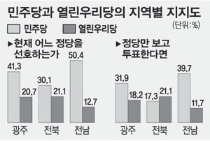 특히 민주당을 탈당한 의원이 6명이나 되는 전북에선 민주당과 열린우리당간의 한판 승부가 벌어질 전망이다. 그러나 광주와 전남은 여전히 민주당 강세를 나타냈다.