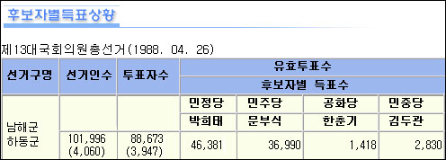 법무부장관 출신 박희태 민정당 후보는 남해중학교 20년 후배인 남해 이어리 이장 출신 김두관 민중당 후보를 맞아 압도적 표차로 물리쳤다.