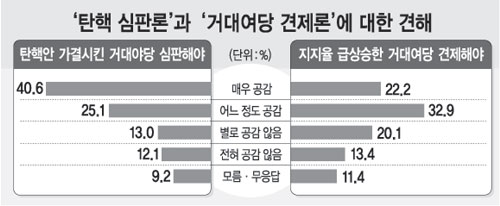 ‘박 대표가 한나라당 득표에 도움이 될 것’이란 평가도 ‘52.9%(지난달 24일)→68.5%(지난달 27일)→75.6%(1일)’로 계속 늘고 있다. 특히 한나라당 지지자들의 기대(‘도움이 될 것’ 93.2%)는 절대적이다.