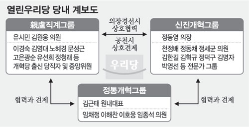 그러나 최근 당 내에서는 정 의장이 총선 후 차기 대선을 염두에 두고 통합적인 이미지를 구축하기 위해서도 친노 직계그룹과 거리를 둘 것이라는 관측도 나돈다. 사태 전개에 따라 총선 후 ‘건설적 결별’ 가능성을 배제할 수 없다는 것이다. 한 핵심 관계자는 “문 본부장이 밝혔듯이 개혁당 출신들의 궁극적 목표는 개혁세력의 정치권 진출인 만큼 이번 총선에서 토대가 굳건해지면 예상치 못한 일이 생길 수도 있다”고 내다봤다.