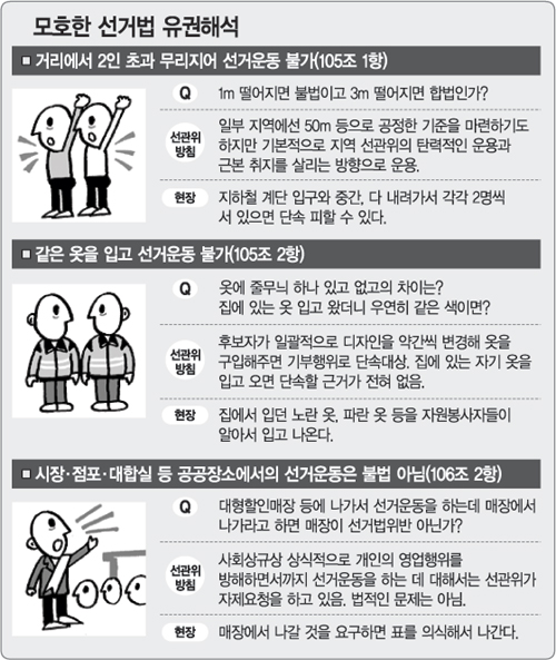 이에 대해 서울의 한 지역선관위 지도계장은 “규정이 지나치게 복잡해 우리도 일일이 지침표를 들춰보며 답하고 있는 실정”이라고 말했다.