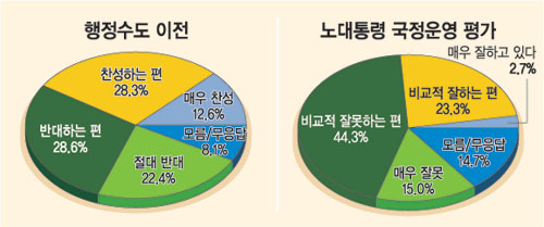 여론조사기관인 현대리서치연구소(HRI)가 3∼5일 전국의 성인 2000명을 대상으로 실시한 전화조사 결과 응답자의 51.0%가 수도 이전 정책에 반대한다고 답했다. 찬성 응답은 40.9%였다.