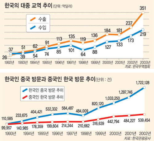 1992년 수교 당시 64억달러(약 7조3800억원)에 불과하던 교역액은 지난해 670억달러(약 77조2500억원)로 급증했다. 최근에는 하루 교역액만 2억3000만달러이고 이 가운데 한국의 흑자 규모는 9400만달러다. 한국의 무역에서 중국이 차지하는 비중은 지난해 15.2%, 올해는 18% 정도가 될 것으로 보인다. 미국을 제치고 최대 교역대상국으로 부상했다.