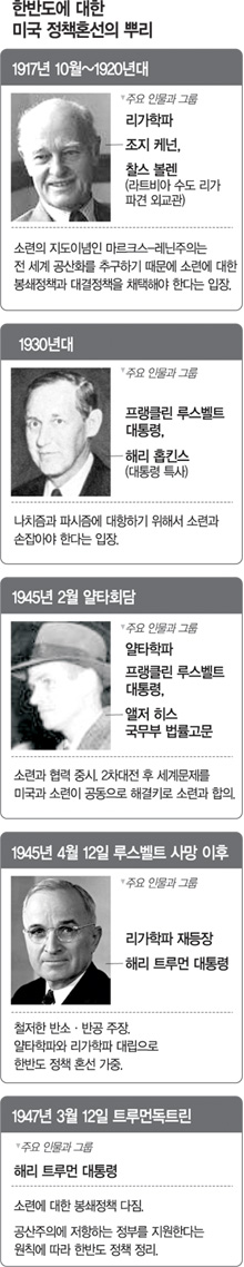 철저한 반소·반공주의자인 트루먼은 얄타학파의 논리를 배척하고 리가학파의 정책을 선호했다. 그렇다고 해도 루스벨트가 만들어놓은 틀을 하루아침에 깨뜨리는 것은 불가능했다. 바로 여기서부터 미국 정부의 세계정책과 그 한 부분으로서의 한반도정책이 혼선을 빚게 됐다. 여전히 일정하게 영향력을 확보하고 있던 얄타학파는 소련과의 협력을 중시했고, 새로 힘을 얻게 된 리가학파는 소련에 대한 강경 대응을 주장했기 때문이다.