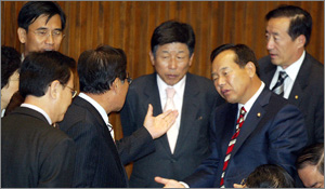 ![]() 15일 오전 10시에 열릴 예정이던 국회 본회의가 1시간 이상 지연되자 열린우리당 의원들이 정국 현안을 놓고 구수회의를 하고 있다. 이날 본회의 지연사태는 한나라당 의원 발언 도중 발생한 마이크 전원 차단 조치에 항의하며 한나라당측이 비공개 의원총회를 개최하는 바람에 빚어졌다. 김경제기자 |