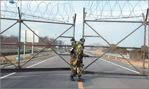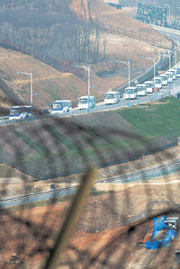▽남북교류협력의 현장=17일 오후 1시 45분 고성군 동해선 북방한계선에 위치한 금강검문소. 별안간 사이렌이 요란스레 울리며 검문소 경비병들이 신속하게 금강통문으로 다가갔다. 동해선 북측 구간 철도 건설 자재를 운반했던 현대아산 차량 10대가 복귀하고 있었다.