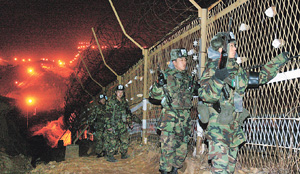 ▽군사 대치 현장=17일 밤 22사단 번개대대가 경비하는 철책선. 강원 양양과 간성 사이에 부는 혹독한 삭풍을 뜻하는 ‘양간지풍(襄杆之風)’이 매섭게 몰아쳤다. 밤을 하얗게 밝힌 18일 새벽 최첨단 열탐지장비(TOD)로 북측을 경계하고 있던 이현신(李賢新·22) 병장은 “최근 주적개념 삭제 논란이 있다고 하지만 북한과 최일선에서 대치하고 있는 장병들에게는 우리의 평화와 아군을 위협하는 적군이 있을 뿐”이라고 잘라 말했다.