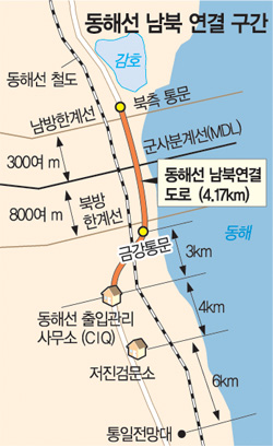 취재진은 동해선 CIQ에서 22사단 측이 제공한 지프에 올라탔다. 새로 개통한 동해선 본선도로 4.17km 중 북방한계선의 남측 금강통문까지 3km를 왕복 2차선 도로를 시원하게 달렸다. 통문부터 북방한계선을 넘어 북측통문이 위치한 1.17km 도로는 북측의 승인을 받지 못해 들어가지 못했다.