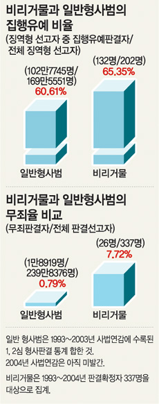 결국 비리 거물들의 경우 △무죄 판결을 받는 비율이 일반인보다 훨씬 높으며 △유죄 판결을 받더라도 형량이 가볍고 △그 형량조차 제대로 복역하는 경우가 드문 것으로 확인된 것이다.