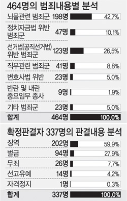 범죄 내용별로는 뇌물 관련죄가 198명(42.7%), 선거법 위반 123명(26.5%), 정치자금법 위반 47명(10.1%), 횡령 배임 등 직무관련 범죄 41명(8.8%), 변호사법 위반 23명(5.0%) 등이었다.