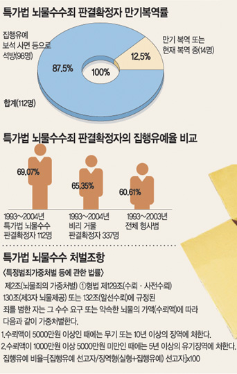 그런데 희한하게도 특가법이 적용되는 거액 수뢰자들의 집행유예 비율은 일반 뇌물죄보다 더 높다. 뇌물액수가 클수록 풀려날 가능성이 높았다는 의미.