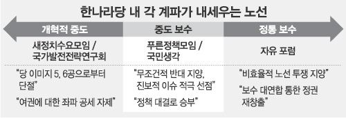 김명주(金命柱) 의원은 “진보의 가치를 과감히 가져와서 보수-진보의 틀을 깨자”고 제안했다. 정병국(鄭柄國) 의원은 “지금 당은 냉전 보수, 강경 보수라는 5, 6공 정당 이미지로부터 단절해야 한다”고 말했다.