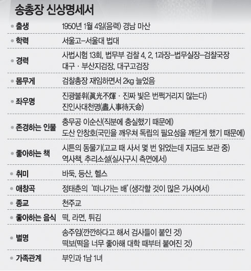 서울지검의 한 간부는 “송 총장은 상황을 면밀히 파악해 깰 때 정확하게 깨고 칭찬할 때 제대로 칭찬한다”며 “이런 점이 단신(161cm)의 송 총장이 조직을 장악하는 힘”이라고 말했다.