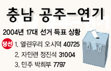 그러나 결정적인 변수는 연기 쪽의 표심이라는 게 현지의 분석이다. 공주시는 일부만 행정도시에 편입되는 반면 연기군은 대부분의 지역이 편입돼 최근 토지 수용 보상과 관련한 불만 여론이 높아지는 등 표심이 유동적으로 변하고 있다. 여기에 지난해 총선에 이어 이번에도 주요 후보가 모두 공주 출신이다. 지난해 총선 당시 열린우리당 오시덕(吳施德) 후보와 자민련으로 출마했던 정 후보가 공주에서는 거의 대등한 승부를 펼쳤지만 오 후보는 유권자 수가 공주의 70% 수준인 연기에서 ‘행정수도 기대론’을 업고 몰표를 얻었다.