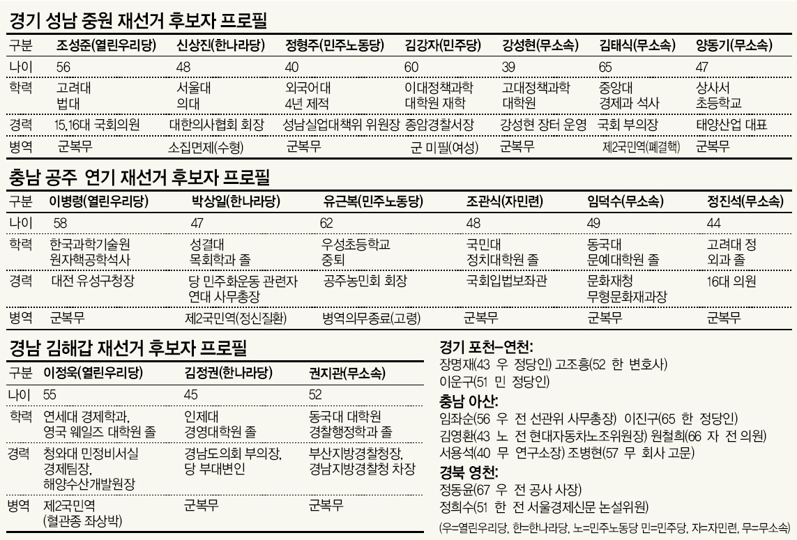 민노당의 정 후보는 “더 이상 기성 정치권에 이 지역을 맡겨봤자 개발이 제대로 되지 않는다”는 논리로 민심을 파고들고 있다. 민주당의 김 후보는 이 지역 일대에 집창촌이 있는 만큼 과거 경찰 재직 시 ‘사창가와의 전쟁’을 치렀던 경력 등을 적극적으로 홍보할 방침이다. 국회부의장을 지낸 무소속 김태식(金台植) 후보는 인물론으로 맞서고 있다.