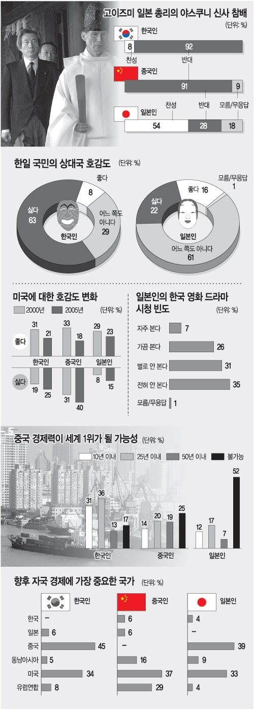 고이즈미 준이치로(小泉純一郞) 일본 총리의 야스쿠니(靖國) 신사 참배에 대한 인식도 극명하게 대비됐다. 한국인(92%)과 중국인(91%)은 거의 모두 반대했으나 일본인은 54%가 찬성했다. 일본 자민당 지지자의 경우 72%가 찬성했다. 같은 맥락에서 한국인과 중국인의 60% 정도가 야스쿠니 신사를 ‘군국주의의 상징’이라고 생각하는 데 반해 일본인의 66%는 단순히 ‘전사자를 추도하는 곳’으로 여기는 것으로 나타났다.