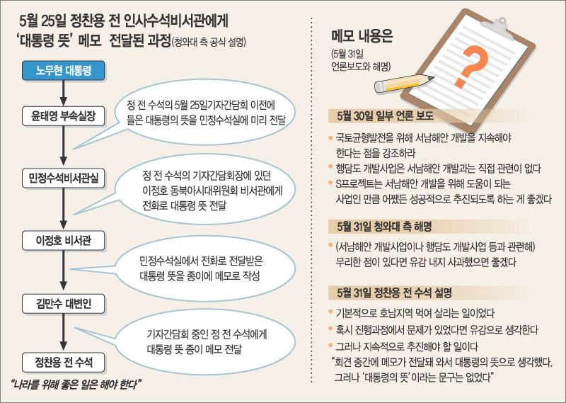 그러나 청와대 측은 31일 “이 메모는 간담회장에 있던 동북아시대위원회의 이정호(李貞浩) 비서관이 작성한 것”이라고 말했다. 정 전 수석이 이를 ‘대통령이 전한 메모’로 혼동했다는 것이다.