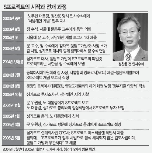 국토개발 분야에는 문외한인 정 전 수석이 S프로젝트에 발을 담그게 된 최초의 경위는 이렇다. 대통령의 ‘특명’을 받은 그는 서울대 문동주 교수에게 용역을 의뢰했고, 문 교수를 통해 김재복 행담도개발㈜ 사장과도 접촉하게 된다.