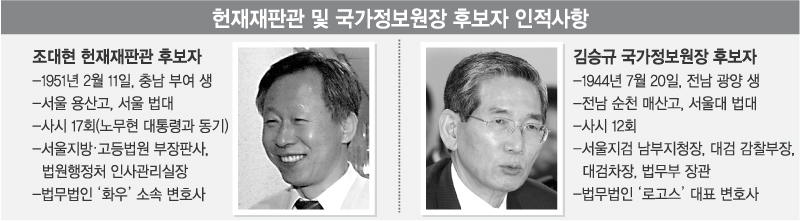조대현(曺大鉉) 헌법재판소 재판관 후보자와 김승규(金昇圭) 국가정보원장 후보자에 대한 인사청문회가 4일과 5일 각각 실시된다.