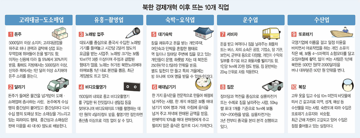 비디오 촬영가와 노래방 주인도 유망 직업이 됐다. 상인들을 재워 주는 ‘대기 숙박업’과 공장 기업소의 화물차를 빌려 운송업을 하는 개인 ‘서비차’ 영업도 흔하다.