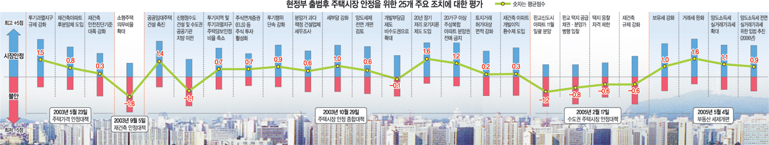 평가는 전국 대학교의 부동산학과 교수 31명, 도시계획 관련학과 교수 및 연구원 64명, 경제학과 교수 및 연구원 55명 등 전문가 150명이 조치별로 +5∼―5점의 점수를 매기는 방식으로 진행했다. +(플러스) 점수가 클수록 시장 안정효과가 크고, ―(마이너스) 점수가 클수록 부정적인 효과가 크다는 의미다.