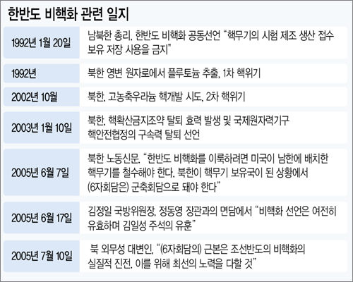 한반도 비핵화 문제가 처음 등장한 것은 1992년 1월 남측의 정원식(鄭元植), 북측의 연형묵(延亨默) 총리가 서명한 한반도 비핵화 공동선언. 그러나 북한은 바로 그해 영변 원자로에서 플루토늄을 추출해 1차 핵위기를 불러왔고 10년 뒤인 2002년에는 고농축우라늄(HEU) 핵개발을 시도해 2차 핵위기를 조성했다.